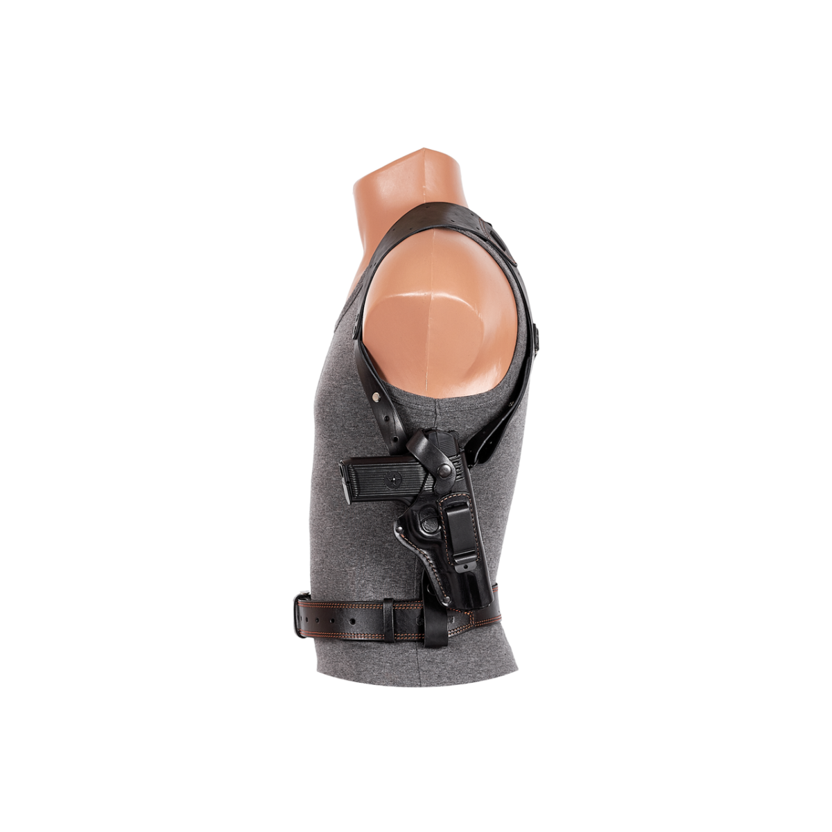 1. Неоплачений варіант, при якому кобура підвішується збоку під рукою за рахунок системи регульованих пасових лямок. При цьому вона може додатково пристібатися до брючному поясу регульованою по висоті знімною ремінною петлею.