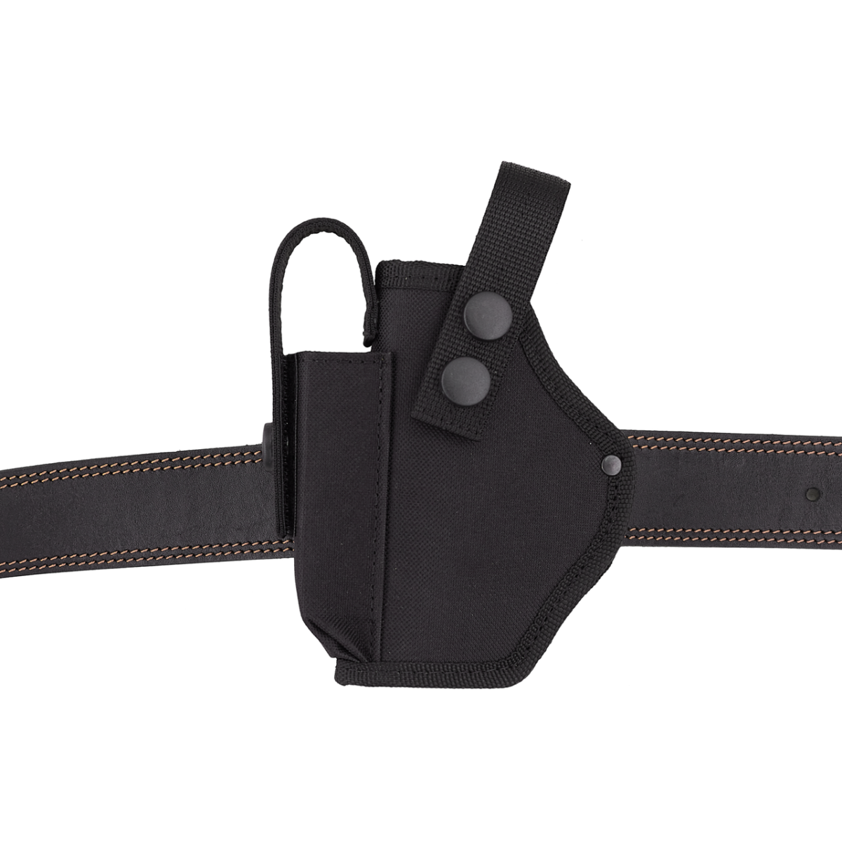 Хлястик кобуры застёгивается на фронтальной стороне на две кнопки, для более надёжной фиксации пистолета. Хлястик чехла под запасной магазин застёгивается на кнопку и дополнительно фиксируется липучкой. Оба хлястика жёсткие, сделаны из прочной полиамидной ленты, шириной 25 мм, продублированной эластичным пластиком.