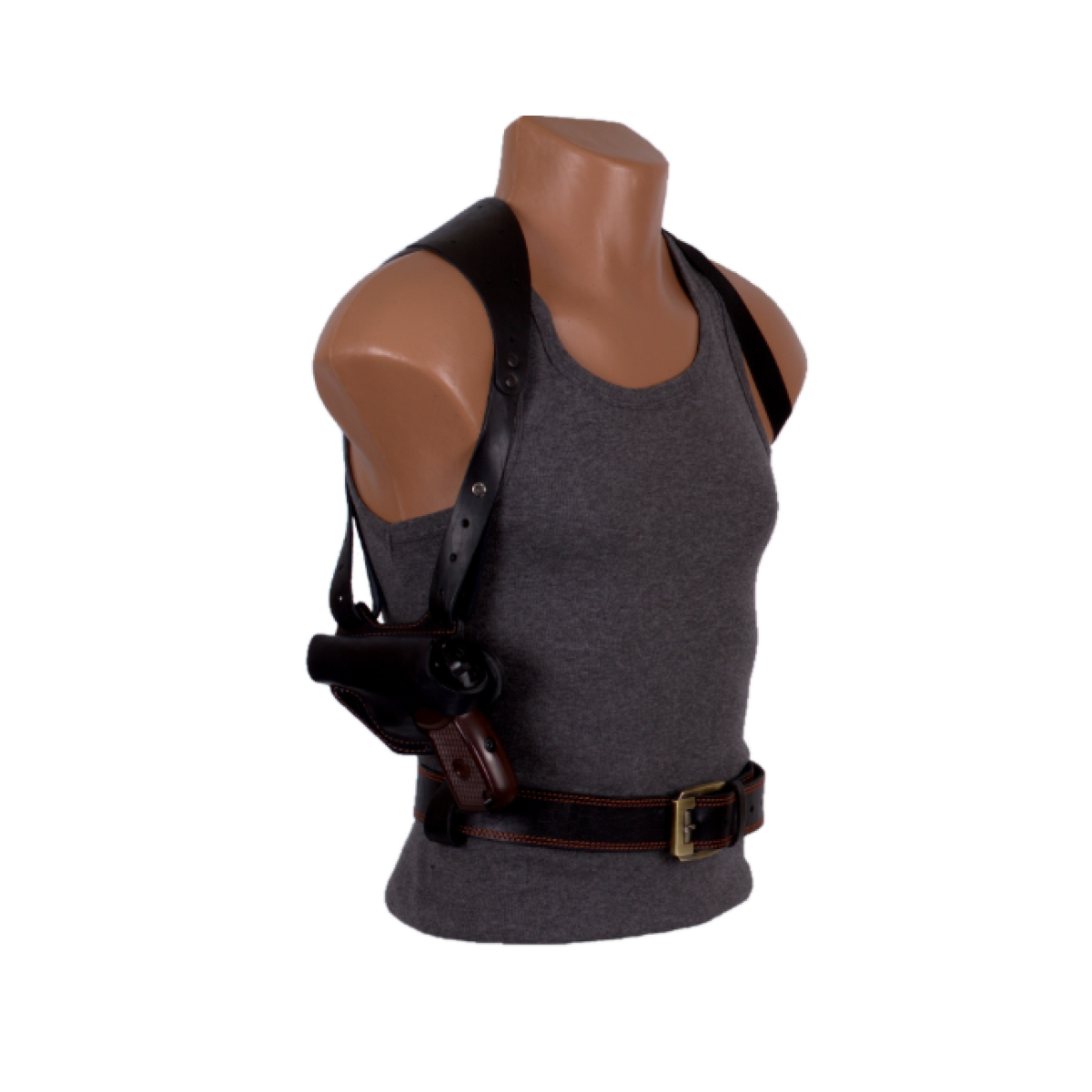 Кобура изготовлена из толстой натуральной кожи высокого качества, а потому прочна, износоустойчива, не теряет формы в процессе эксплуатации. Лямки системы подвески также изготовлены из добротных кожаных ремней и не растягиваются под воздействием веса и времени. Благодаря возможности регулировки, вся система в целом не сковывает движений стрелка.