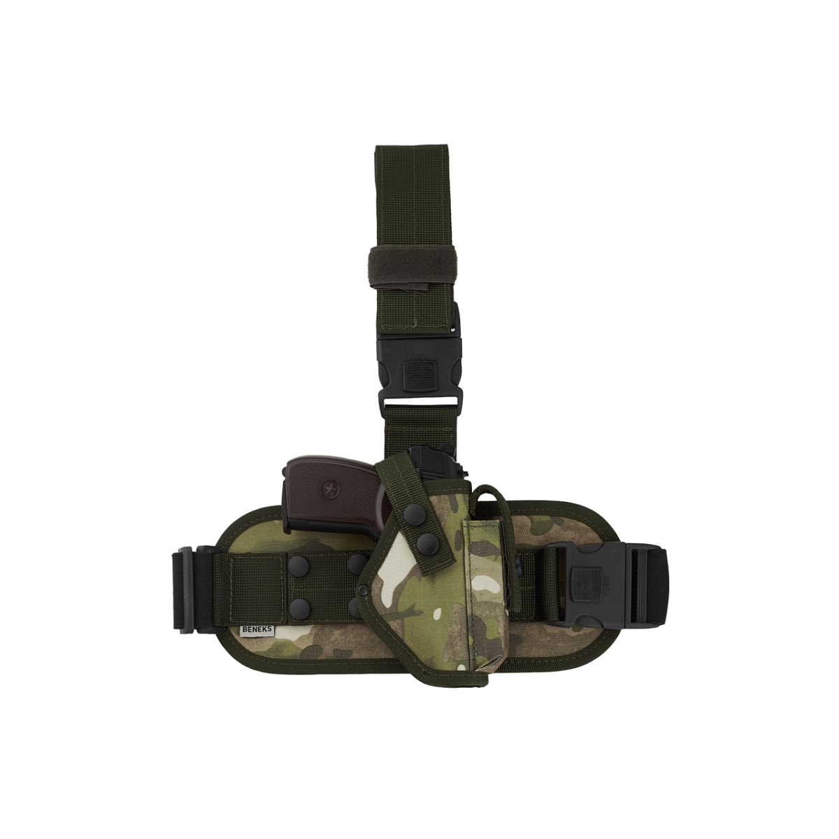 Кобура з чохлом під запасний магазин фіксується на платформі в одному положенні - вертикально. Кобура одягається на поліамідну стропу, пришиту до платформи з одного боку. З іншого боку стропа надійно застібається на чотири кнопки. Додаткову фіксацію кобури забезпечує стрічка велкро (липучка), що нашитий на стропу і задню накладку кобури.