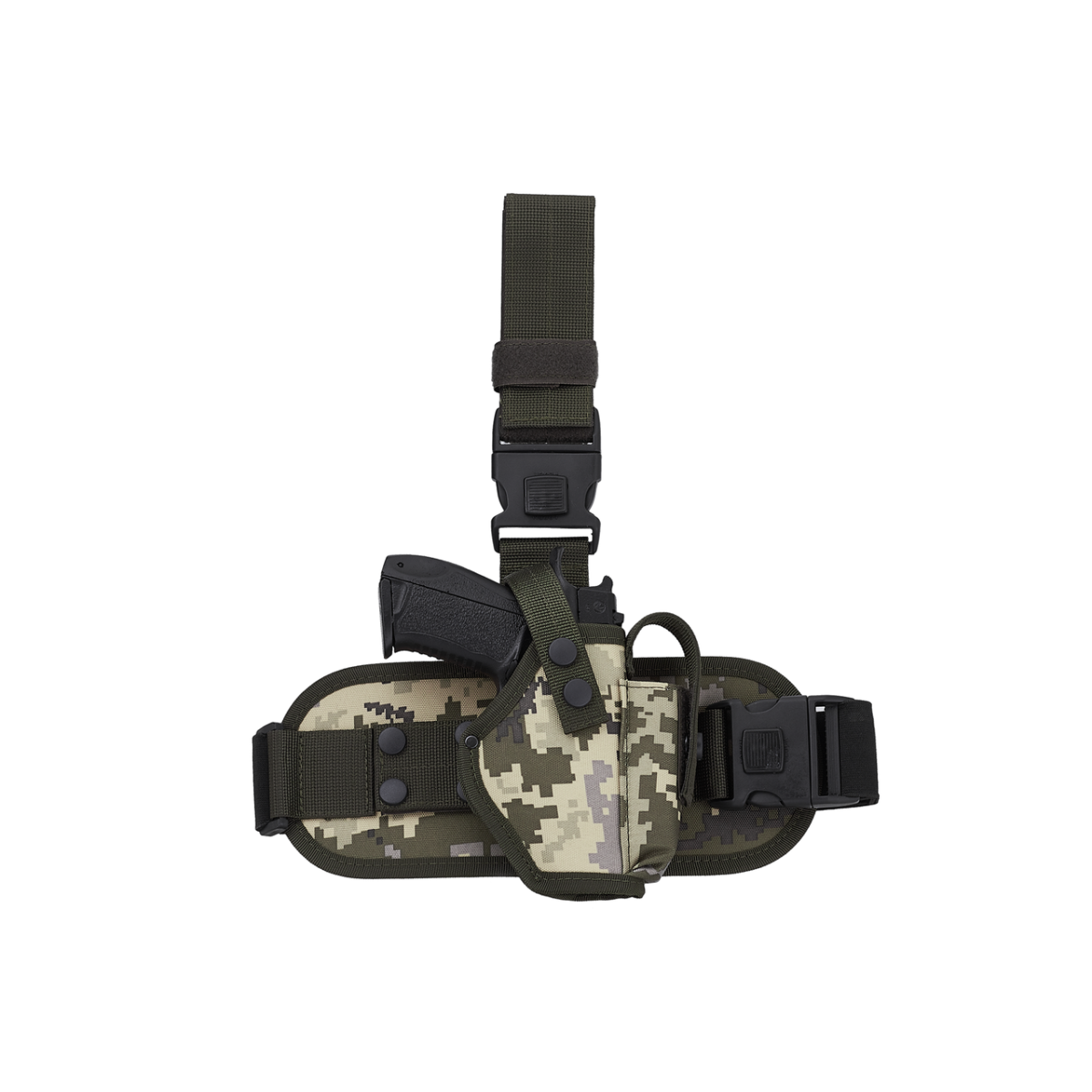 Кобура стегновий Форт-17 з платформою (oxford 600d, піксель) Призначена для носіння пістолета Форт-17 і інших конструктивно схожих моделей Складається з платформи і кобури з чохлом під запасний магазин. Кобура відокремлюється від платформи і може носиться на поясному ремені. Кобура з чохлом під запасний магазин фіксується на платформі в одному положенні - вертикально. Кобура одягається на поліамідну стропу, пришиту до платформи з одного боку. З іншого боку стропа надійно застібається на чотири кнопки. Додаткову фіксацію кобури забезпечує стрічка велкро (липучка), що нашитий на стропу і задню накладку кобури. Сама кобура виготовлена з комбінації синтетичних матеріалів. Тканина лицьового шару oxford 600dцвет “піксель“, середній шар - еластичний пластик, виворітний шар - спінений синтетичний матеріал з велюровим покриттям. Хлястик кобури застібається на фронтальній стороні на дві кнопки, для більш надійної фіксації пістолета. Хлястик чохла під запасний магазин застібається на кнопку і додатково фіксується липучкою. Обидва хлястика жорсткі, зроблені з міцної поліамідної стрічки, шириною 25 мм, продубльованою еластичним пластиком. Пистолет “сидит“ в кобуре плотно. При извлечённом пистолете, кобура хорошо держит форму благодаря жёсткой основе. Платформа изготовлена из комбинации тех же материалов, что и кобура. К бедру платформа фиксируется при помощи плотной резинки шириной 50 мм, с регулируемой длиной. Резинка застёгивается на пластиковую пряжку-фаст с замком. К поясному ремню платформа фиксируется петлёй из полиамидной стропы с нашитой лентой велкро (липучкой). Липучка на стропе позволяет регулировать положение платформы по вертикали. К верхней стропе платформа также пристёгивается на пряжку-фаст с замком. Ця кобура може бути виготовлена для лівші.